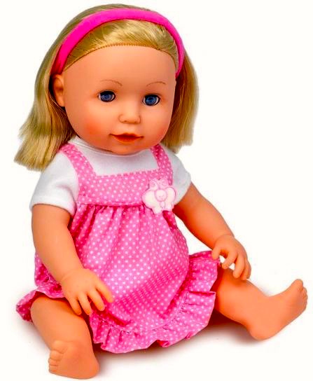Tiny Tears was sold in a pink-and-white checked dress or a romper with a baby bottle and a small pipe that blew bubbles when filled with a soapy solution and inserted into the doll’s open mouth.