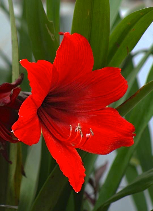 Hippeastrum is a genus of about 90 species and over 600 hybrids and cultivars of perennial herbaceous bulbous plants. They generally have large fleshy bulbs and tall broad leaves, generally evergreen, and large red or purple flowers.