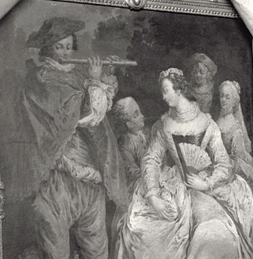 A flute-player provides musical accompaniment to a garden scene between four upper-class Europeans in (roughly) 18th-century fancy dress (suitable for court appearances, or official portraits). The scene might, I thought, be a courtship encounter between the couple in the foreground, with the woman’s parents standing behind her. (Note how much background information and practical reasoning is needed just to make these minimal speculations about what’s depicted in the painting.)