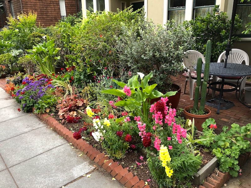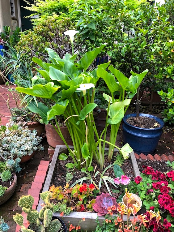 A sweep of (much of) the garden explosion, showing the two stands of white callas, both about 2½ feet tall, both blooming for at least 6 weeks now (they are plants that span the local botanical seasons spring and early summer, which is where we are now):