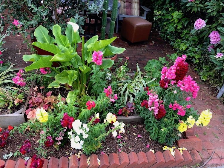 (#1) The strikingly colored spikes are snapdragons, a feature of botanical winter locally, though they will bloom into the summer (this photo and two others below by Kim Darnell)