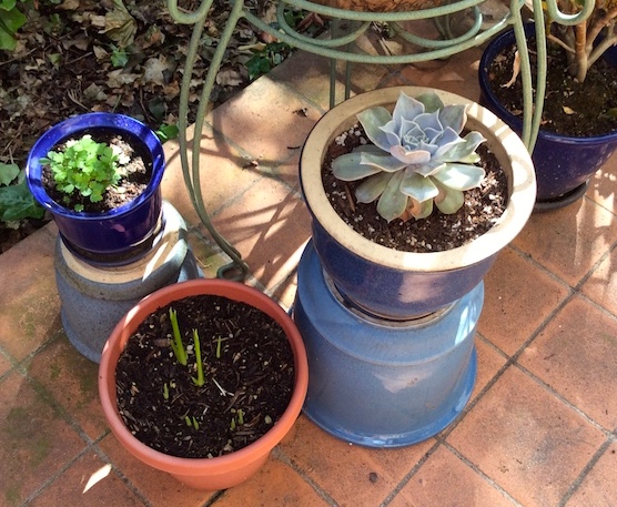 Cairo Callen. In the modest confines of my front patio, there grows a pot of purple callas, which I refer to as Cairo Callen (from Woody Allen’s Purple Rose of Cairo + Michael Callen’s Purple Heart), a small fancy hybrid that comes into bloom months later than the Super Callas and blooms relatively briefly. Here’s Cairo Callen and two of his buddies just a week ago, from my 5/2/19 posting “Early summer”: