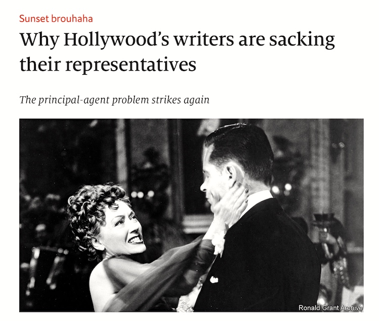 (#1) Kicker head + main head (in print: “Worried by declining salaries, Hollywood’s writers sack their agents”) + subhead