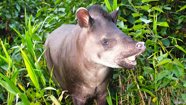 (#8) Illustration from the EconomistA tapir (/ˈteɪpər/ TAY-pər, /ˈteɪpɪər/ TAY-peer or /təˈpɪər/ tə-PEER, /ˈteɪpiːər/ TAY-pee-ər) [AZ: the last is my preferred pronunciation, but I have no idea where I got it from] is a large, herbivorous mammal, similar in shape to a pig, with a short, prehensile nose trunk. Tapirs inhabit jungle and forest regions of South America, Central America, and Southeast Asia. The five extant species of tapirs, all of the family Tapiridae and the genus Tapirus, are the Brazilian tapir, the Malayan tapir, the Baird’s tapir, the kabomani tapir and the mountain tapir. … The closest extant relatives of the tapirs are the other odd-toed ungulates, which include horses, donkeys, zebras and rhinoceroses.