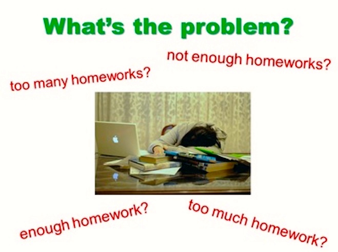 But what Karen picks up on is the use the noun homework as a C(ount) noun, clearly so because it occurs in the plural form homeworks here; for the M(ass) noun homework, the usage would be: This homework is way. too. hard. Or else: These homework assignments are way. too. hard.