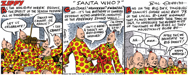 Verbs of playful movement. Something of a Zippy specialty. In my 4/28/19 posting “All ˈlaundry ˈis a ˈblur of ˈstatic ˈcling”, Zippy strips on cavorting and gamboling —