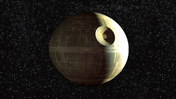 The Death Star is a type of fictional mobile space station and galactic superweapon featured in the Star Wars space-opera franchise. The first Death Star, introduced in the original Star Wars film [1977], is stated to be more than 100 km in diameter, and is crewed by an estimated 1.7 million military personnel and 400,000 droids. The second Death Star, which appears in Return of the Jedi is significantly larger, between 160 km to 900 km in diameter, and technologically more powerful than its predecessor. Both versions of these moon-sized fortresses are designed for massive power-projection capabilities, each capable of destroying an entire planet with a blast from its superlasers.
