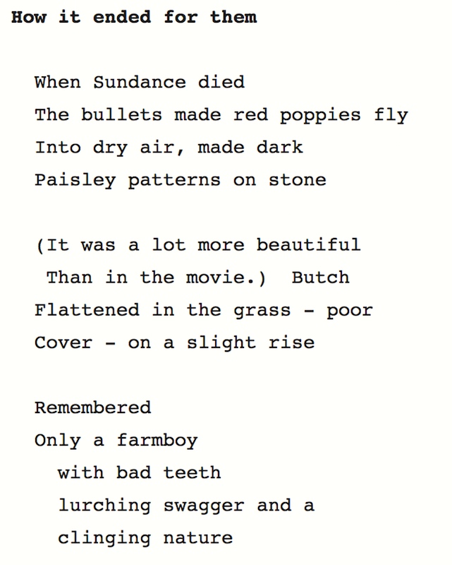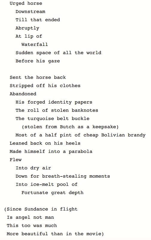 some writing I did starting in 1994: a magical realist (and gay gay gay and very sexually explicit) recounting of the story of Butch Cassidy and the Sundance Kid, from Sundance’s point of view. Sundance and Butch, a fiction with interpolated poetry.