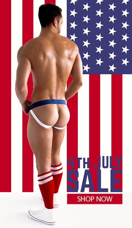 So we have the 4th of July as a celebration of commercial mansex (every holday is a sales opportunity): selling premium men’s underwear by hawking men’s bodies; and offering gay porn sales, usually with a holiday-themed image (naked bodies wrapped in the flag are a conventional presentation, but there are many other possibilities). From this year’s rich crop of ads, I’ve chosen one of each type: a holiday ad for DJX homowear in the Trough line; and an ad for the political-satire gayporn film Cauke for President from TitanMen.