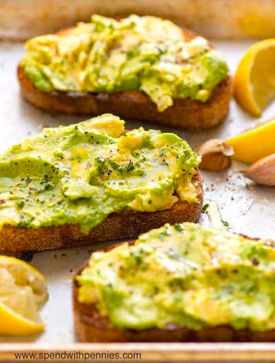 (#4) Your basic mashed avocado on toasted sourdough, sprinkled with salt and pepper — plus, you rub the hot toast with garlic; squeeze fresh lemon juice on it; and drizzle it with olive oil and sprinkle it with chopped cilantro or parsleyAvocado toast is a type of open sandwich or toast made with mashed avocado and salt, pepper, and citrus juice on toast. Potential additional ingredients that enhance the flavor are olive oil, hummus, red pepper flakes, feta, dukkah, tomato, and many other toppings.