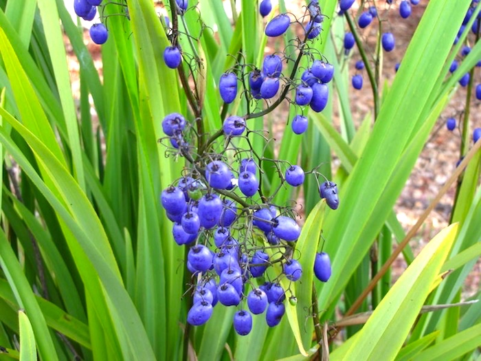(#1) Strap-like leaves and flaxflower-blue berriesDianella caerulea, commonly known as the blue flax-lily, blueberry lily, or paroo lily, is a perennial herb of the family Asphodelaceae, subfamily Hemerocallidoideae [the subfamily of daylily plants], found across the eastern states of Australia and Tasmania. It is a herbaceous strappy perennial plant to a metre high, with dark green blade-like leaves to 70 cm long. Blue flowers in spring and summer are followed by indigo-coloured berries. It adapts readily to cultivation and is commonly seen in Australian gardens and amenities plantings.