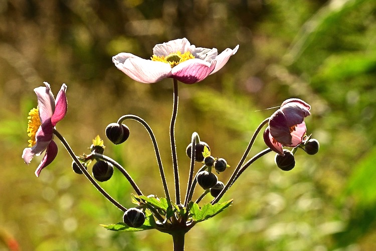 Also still in bud, autumn-blooming anemones (hybrids with single 5-petaled flowers in white and pink), a very modest flower that prefers partial shade; individual plants are sprinkled under trees in the garden. From the pixabay site, fall anemones, some in bloom, some in bud: