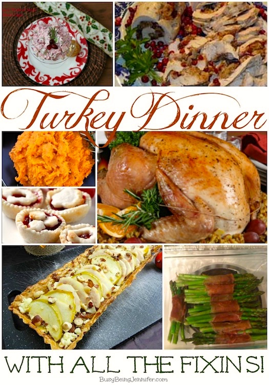 (#2) From the Busy Being Jennifer site, roast turkey with cornbread stuffing, surrounded by (from the top left), a sampling of fixings, including desserts: cranberry Waldorf salad, cranberry stuffed turkey breast, rosemary mashed sweet potatoes, cherry pie bites, pear and goat cheese tart, prosciutto asparagus bundlesThe site provides a number of alternatives. Of course, each American household has its own preferences. From a reader on this site: “We usually have turkey, ham, beans, potato salad, hot rolls, fruit salad, cornbread dressing, and broccoli cheese rice casserole. The desserts are: apple pie, pumpkin pie, chocolate pie, and usually a buttermilk pie.”