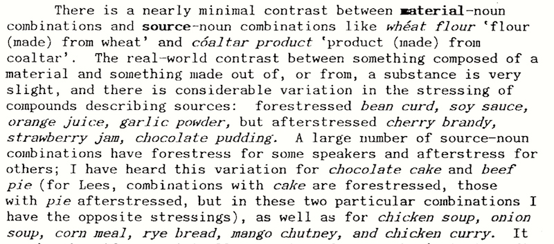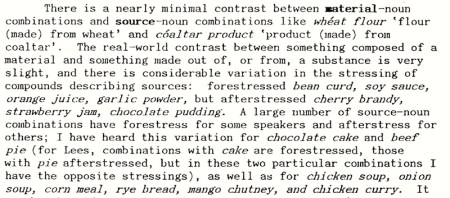 A note on accent. There’s a subtle accentual difference between use/purpose compounds and source/ingredient compounds. Put contrastive accent aside in what follows.