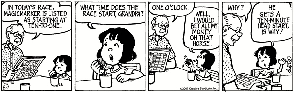 RATIO uses. Betting by odds-against is widespread, but far from ubiquitous, and only rarely engaged in by children, so it’s scarcely a surprise that such a reading of 10 to 1 doesn’t occur to Ruthie (even though her grandfather is talking about horse racing, a domain in which betting by odds-against is routine).