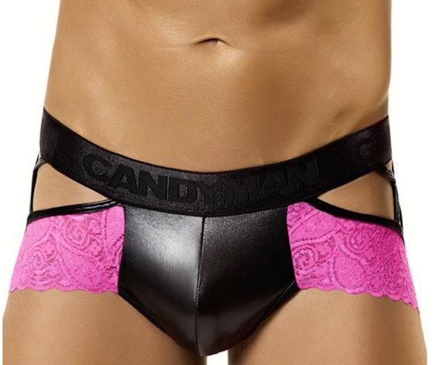 Then, way flagrant, in saturated pink, with lace straps — their fagginess offset by a sturdy pouch (and waistband) of masculine black stretch microfiber: a Mensuas CandyMan jockstrap in pink (also available in black, blue, and green):