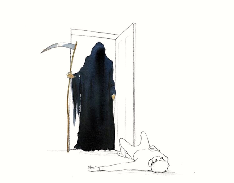 — On the third, the pop cultural figure of the Grim Reaper: a personification of death as a tall male figure in a black hooded floor-length robe, either skull-faced or with a black void for a face, and bearing a scythe to cut the cord of life, often also an hourglass showing the sands of a lifetime running out. The GR arrives before his victim (usually at a door, symbolizing the boundary between life and death) as an apparition signaling the last moment, and announcing bluntly, “I AM DEATH”.