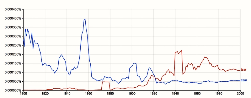 I was struck by NOAD‘s listing the noun under the spelling variant TSAR, having believed that CZAR was the most common spelling in modern AmE — and knowing the NOAD strives to list the currently most frequent spellings and meanings first in its entries. So I went to Google’s Ngram software, and discovered that my impression was incorrect, at least as far as spellings in the books in Google’s archives go: