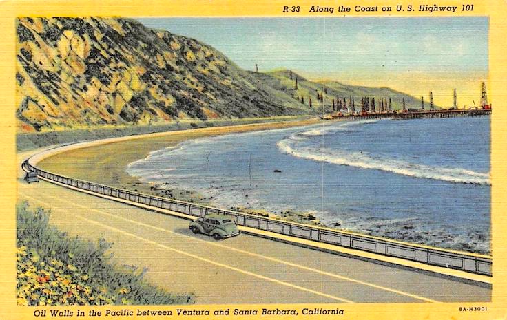 (#5) A 1940s postcard showing a section of the Ventura Freeway, a section that is now both US 101 and SR 1U.S. Route 101, or U.S. Highway 101 (US 101) is a north–south United States Numbered Highway that runs through the states of California [with its southern terminus in Los Angeles], Oregon, and Washington, on the West Coast of the United States. It is also known as El Camino Real (The Royal Road) where its route along the southern and central California coast approximates the old trail which linked the Spanish missions, pueblos, and presidios. It merges at some points [in particular, around Ventura] with California State Route 1 (SR 1).