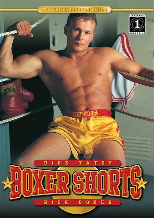 Also, because wrestling and boxing are (sweaty) contact sports done by muscular men in minimal clothing, the sports have high homoerotic potential; there are, in fact, extensive genres of gay porn videos with these sports as themes, and their characteristic clothing items — wrestling singlets and boxing shorts — pick up considerable homoerotic punch on their own as a result. The porn and the boxing shorts together in this vibrantly gold cover for a 1995 video Boxer Shorts (originally from All Worlds Video):