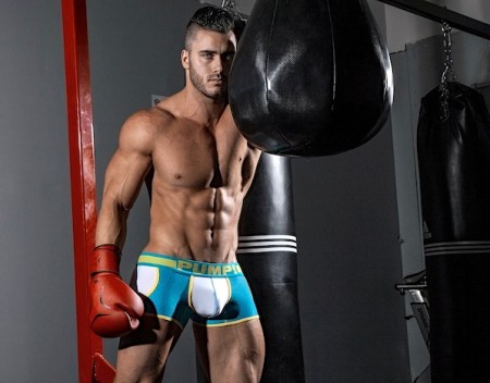 Meanwhile, plenty of premium men’s underwear companies sell excellent athletic shorts of the boxer type, and of course boxer shorts, and boxer briefs as well, and the models are often posed in boxing gyms, for high-masculine authenticity. But one company, Pump!, is particularly devoted to presenting its package-displaying boxer briefs in boxing-gym setttings. Two examples from earlier postings on this blog: