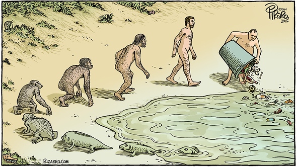 — in my 8/1/15 posting “Bizarro devolution”, this cartoon illustrating the “ascent of man” as a biological species and then his descent (devolution, sense b) into a polluter of his ancestral waters: