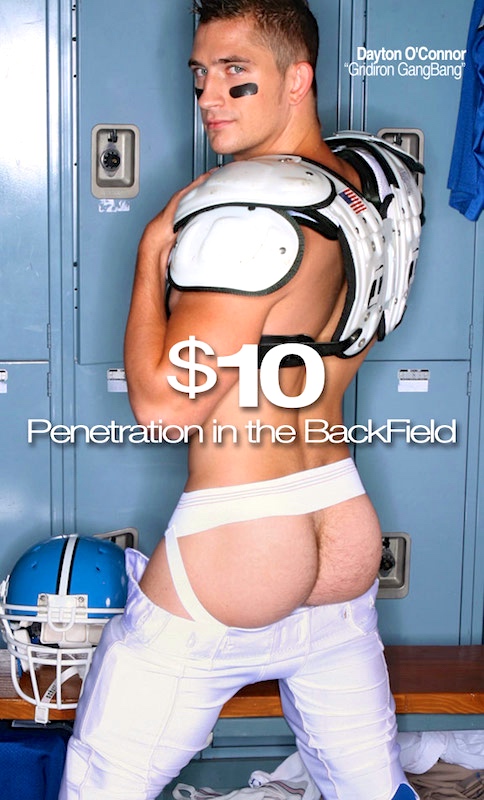 On Super Bowl 50, a gay gangbang, language play in porn, and the careening career of gay pornstar Dayton O’Connor, all of this inspired by an ad today under the header “C1R Locker Room Super Bowl Pass”, with two stills from the Channel 1 Releasing gay porn flick Gridiron Gang Bang: a locker room scene and a rear shot of Dayton O’Connor in football gear.