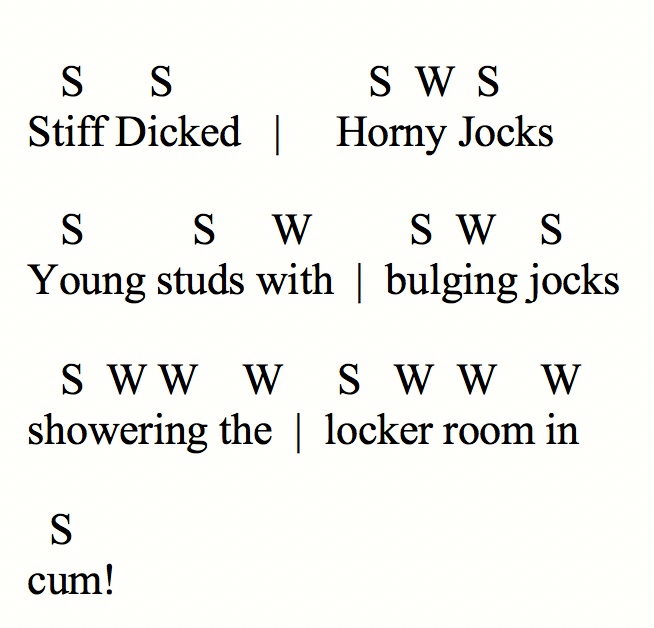 Note on the ad copy for JS&C. A bit of excellent iconic prosody built on conventional dirty talk: four pile-driving feet followed by two lightly racing feet: hard deep fucking followed by a rapid shower of cum: