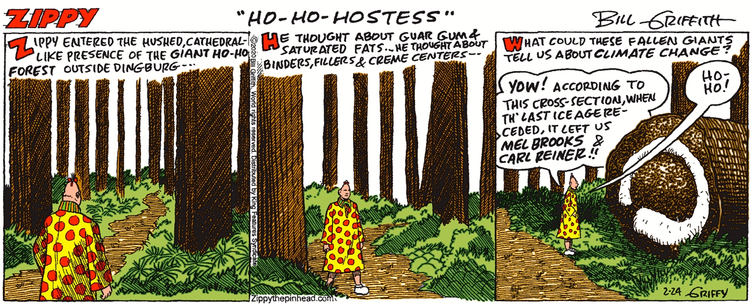 Snack-food Swiss rolls of the forest. The stately giant Ho Ho tree is the subject of #1 and #2. See my 12/17/18 posting “Four Swiss rolls”, about cake roulades, of which Ho Hos are a snack-food exemplar. As for Carl Reiner and Mel Brooks, from Wikipedia on Reiner: