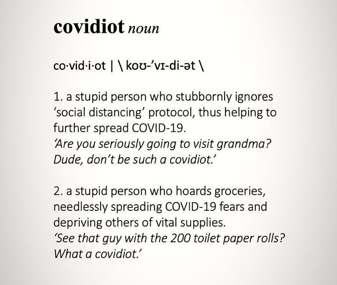 Pandemic idiots. Appearing suddenly in the past few days, covidiot: covid + idiot (where covid stands for the disease name COVID-19), for someone who flouts reasonable precautions, putting themselves or those around them in danger. The portmanteau was pretty much guaranteed to be coined, probably by many people at once, in response to flagrantly stupid behaviors, especially during college spring break festivities on beaches.