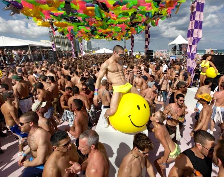 (#2) Caption: “Amir Hamza, a volunteer from Las Vegas, dances with a large yellow smiley face balloon on a raised platform beneath a canopy of inflatable pool floats at the Winter Party Festival on Miami Beach, sponsored by the National LGBTQ Task Force, on March 1, 2009.” (Miami Herald photo)Nine people who attended Winter Party Festival, an annual event that draws thousands of gay men to Miami Beach, have reported testing positive for COVID-19, the respiratory illness caused by the new coronavirus, according to the LGBTQ Task Force, which organized the festival.