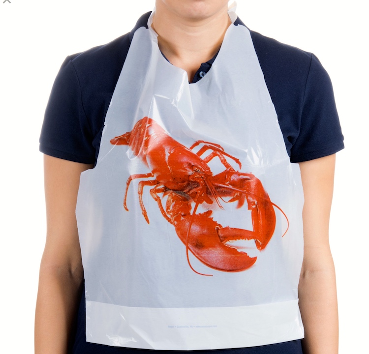 Lobster bibs for adults are mostly disposable plastic or paper, but sometimes washable cotton. From the Webstaurant (portmanteu alert!) store site: