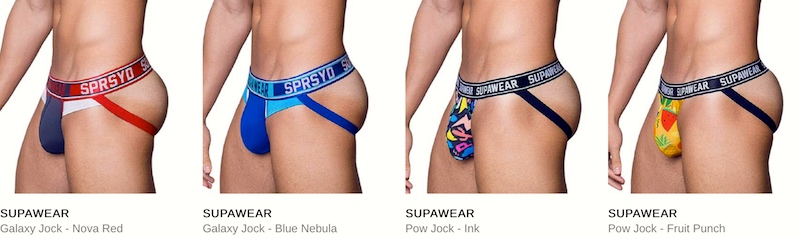 (#4) Two jocks from the Galaxy line, featuring intense bright colors; and two from the POW line, with fancifully patterned pouches — notably the Fruit Punch jock, with a variety of colorful fruits (you can see a strawberry and part of a pineapple)