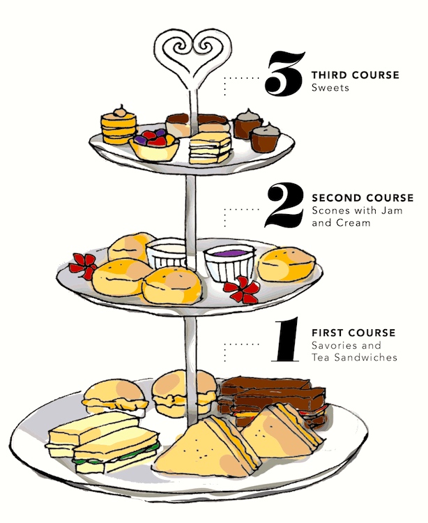 Traditional afternoon tea is served in three courses and usually on a three-tiered tray alongside a pot of tea. This illustrated guide shows what order afternoon tea should be eaten.