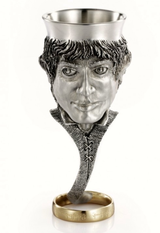 (#5) Company copy: “One of the smallest members of the Fellowship, but one with the gravest task. As Ringbearer, young Frodo Baggins must traverse Middle-earth to destroy the Master-Ring, gilt in 24K gold and forming the base of this unique goblet. It carries the infamous Black Speech inscription ‘Ash nazg durbatulûk, ash nazg gimbatul, ash nazg thrakatulûk agh burzum-ishi krimpatul’. One Ring to rule them all, One Ring to find them, One Ring to bring them all and in the Darkness bind them.
