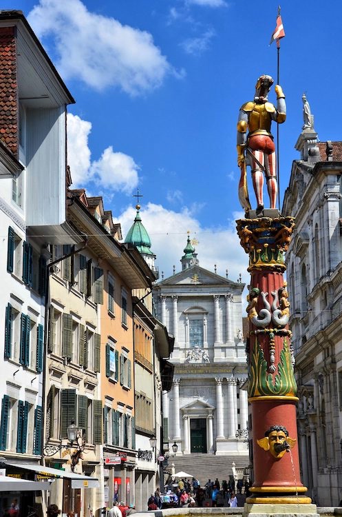 Saint Ursus Fountain and Cathedral in Solothurn, Switzerland: Ursus is the patron saint of Solothurn, Switzerland. He was a Roman Christian who was beheaded in 286 AD for refusing to worship false gods, along with Saint Victor and 66 other soldiers who had converted to Christianity together. This fountain in Marktplatz, which was created in 1545 by Albrecht von Nürnberg, shows the saint in his Theban Legion uniform. In the background is the Cathedral of St. Ursus where he is buried. [His feast day is September 30th.]