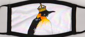 From Elizabeth Daingerfield Zwicky on Sunday, some delightful small gifts for this difficult time: two face masks — a piece of op art turned into a mask, and a fanciful Emperor Penguin [Elizabeth insists it’s an Emperor, but I was convinced it was a King] with a crown — and a very large, very political tea towel.