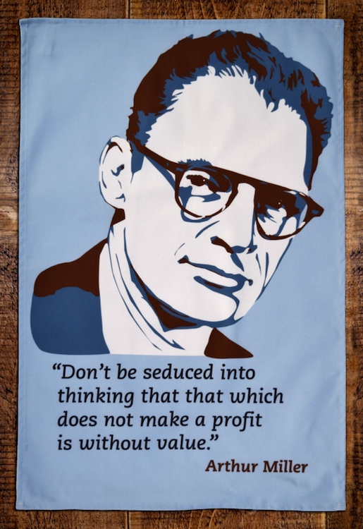 This tea towel celebrates Arthur Miller, one of the leading US playwrights of the 20th century, with notable works including All My Sons, Death of a Salesman, and The Crucible. He based this latter play on the 17th-century witchcraft trials in Salem, a series of persecutions that he considered an echo of the McCarthyism (named after Senator Joe McCarthy) of his own day, when investigations of alleged subversive activities were widespread…