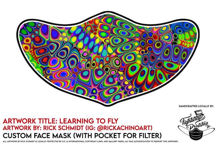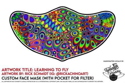 Almost all the masks are his own artworks, though a few are from artist friends. So it is with Learning to Fly by Rick Schmidt: