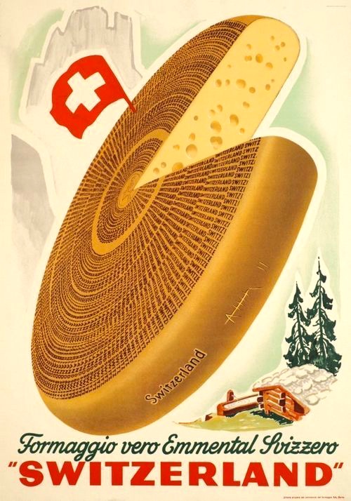 (#5) 1948 advertising poster, artist not knownSwiss cheese is a generic name in North America for several related varieties of cheese, mainly of North American manufacture, which resemble Emmental cheese, a yellow, medium-hard cheese that originated in the area around Emmental, in Switzerland. (from Wikipedia)