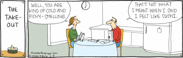 We’ve been here before, sort of, on this blog. From my 2/19/12 posting “I feel like sushi”, about a Rhymes With Orange strip: