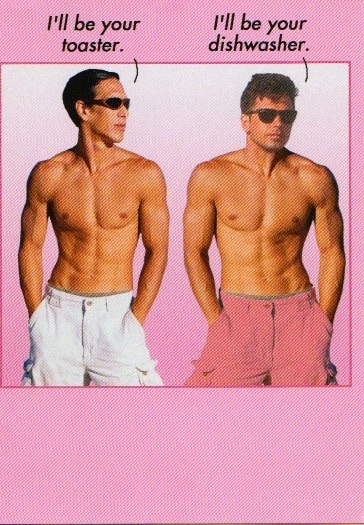 The Tomato birthday card. A birthday card — a Tomato® card (from RedtreeStudios.com) from Jeanne Dusseault, dated 9/19/19 (a bit late for my birthday on 9/6), with two entertaining HTC guys (displaying their pecs and abs, looking casual in the crotch):