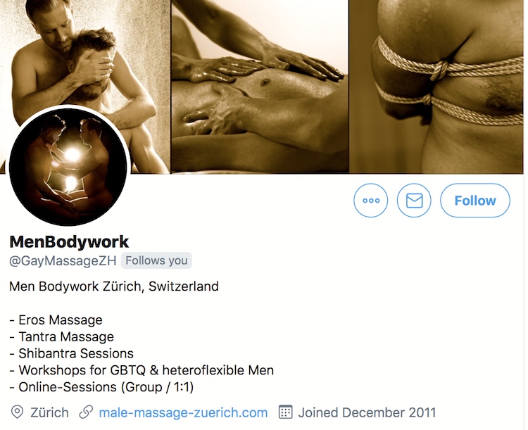 Today, August 1st (rabbit rabbit rabbit), is Swiss National Day, which I will celebrate by observing that (female) prostitution has been legal — but of course regulated — in Switzerland since 1942, and male prostitution since 1992. I mention this not just because I observe and comment on sexual practices as social customs, but specifically because a few days ago (7/29), a new follower of mine on Twitter popped up: MenBodywork, a Swiss company offering sexual massage for men — and earnestly promoting sexualized gay male sociability. (Sign me up, Scotty.)