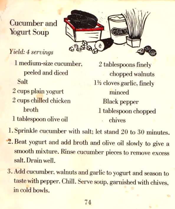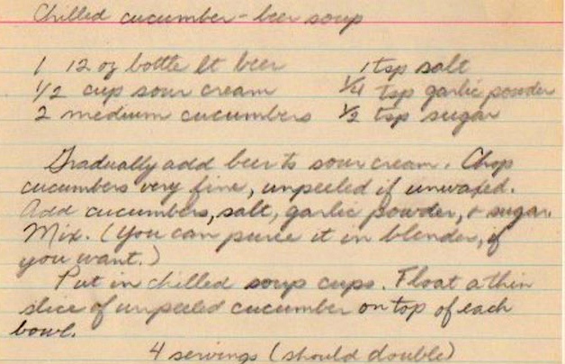 — Cucumber-beer soup, from Elsie Masterson’s Blueberry Hill Cookbook, 1st published 1959:
