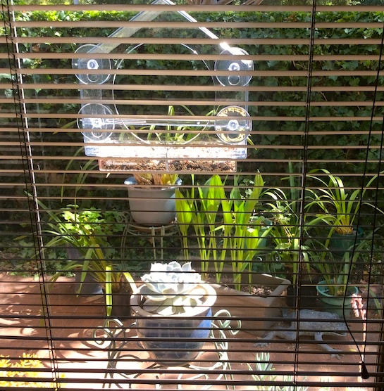 … In an attempt to relieve my evident distress at birdlessness, Kim Darnell got me a really cool bird feeder, a window model from the Nature Anywhere company, which specializes in bird feeders