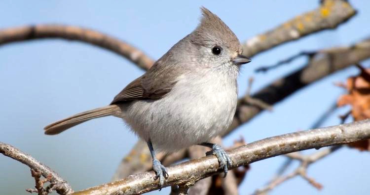 The oak titmouse is a small, brown-tinged gray bird with small tuft or crest. The face is plain, and the undersides are a lighter gray. Sexes are similar, as there is very little to no sexual dimorphism.