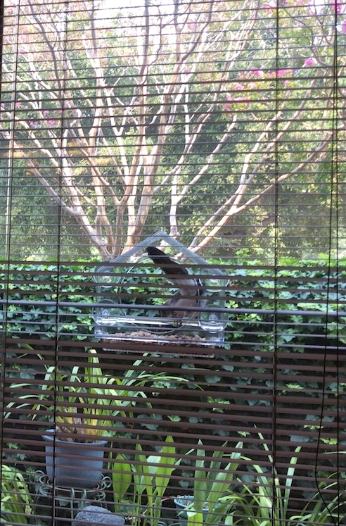 Meanwhile, my creatures — the birds and squirrels — are back to merely feeding, instead of eating ravenously as if the world were coming to an end. I now have two transparent bird feeders attached to the big windows by my work table; the birds that eat from feeders quickly became familiar with the new one, and they now come to the two of them about equally.