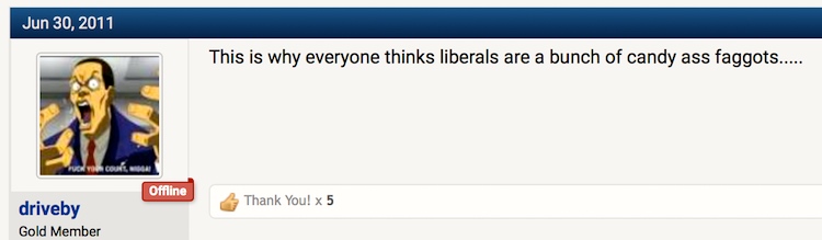 Second observation. A complication. The faggot of candy-ass faggot is itself potentially ambiguous, between its use to refer to a male homosexual and its use as a generic insult; cocksucker is subject to a parallel ambiguity, between a sexual reading and an insult reading. But the insult readings get their power from offense of the sexual readings, so it’s not always easy to tell which one you’re looking at.