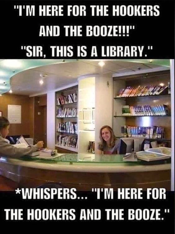 The patron, however, disregards the clear communicative intent of the librarian and chooses to respond as if it were a shush, so repeats, verbatim, his preposterous announcement that he’s looking for hookers and booze — but in a whisper. Absurdly, fixing the form but not the content.