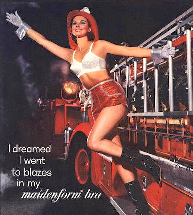 (#2) Young women in their bras in all sorts of preposterous circumstances — here as a firefighter